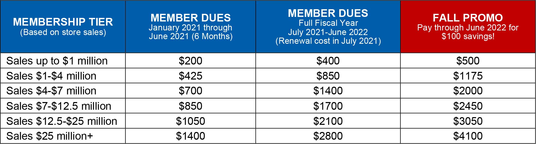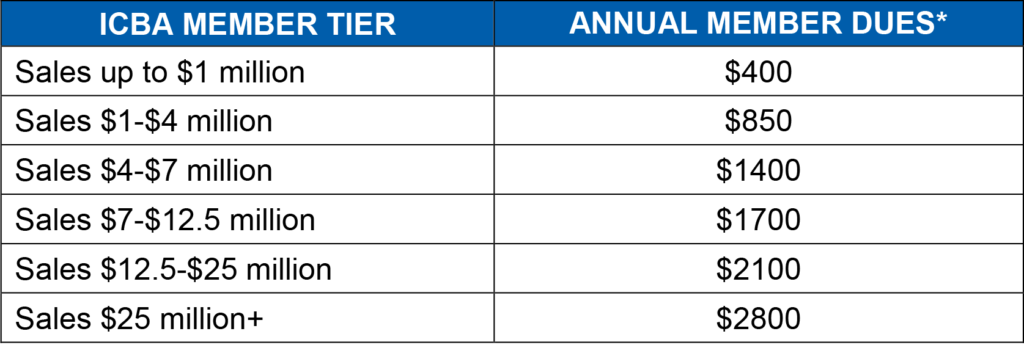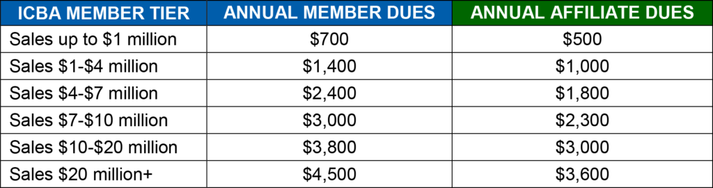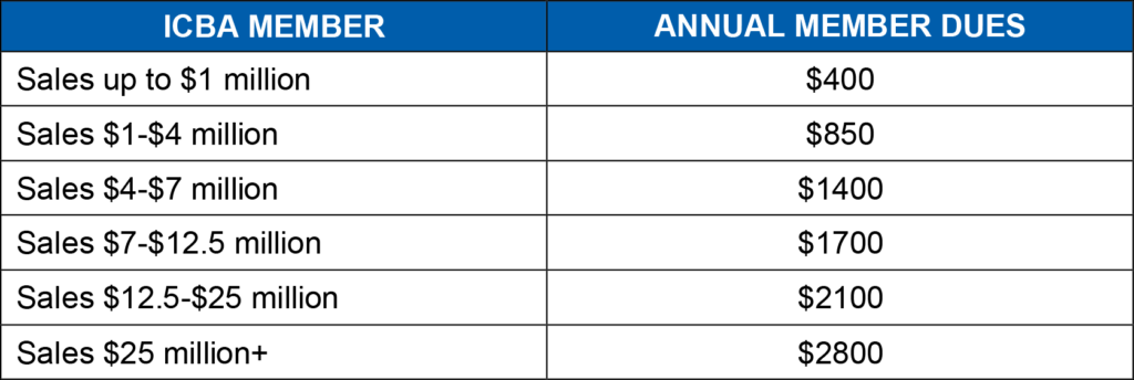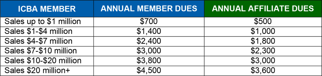 The ICBA Membership year runs July 1 through June 30. Dues are based on your store’s annual sales. For New Members electing to activate their ICBA Membership before July 1, Membership will be pro-rated at a monthly rate plus the full year dues as shown below. Note that there are different pricing tiers for stores in the U.S. and Canada, and they are outlined in separate charts below.