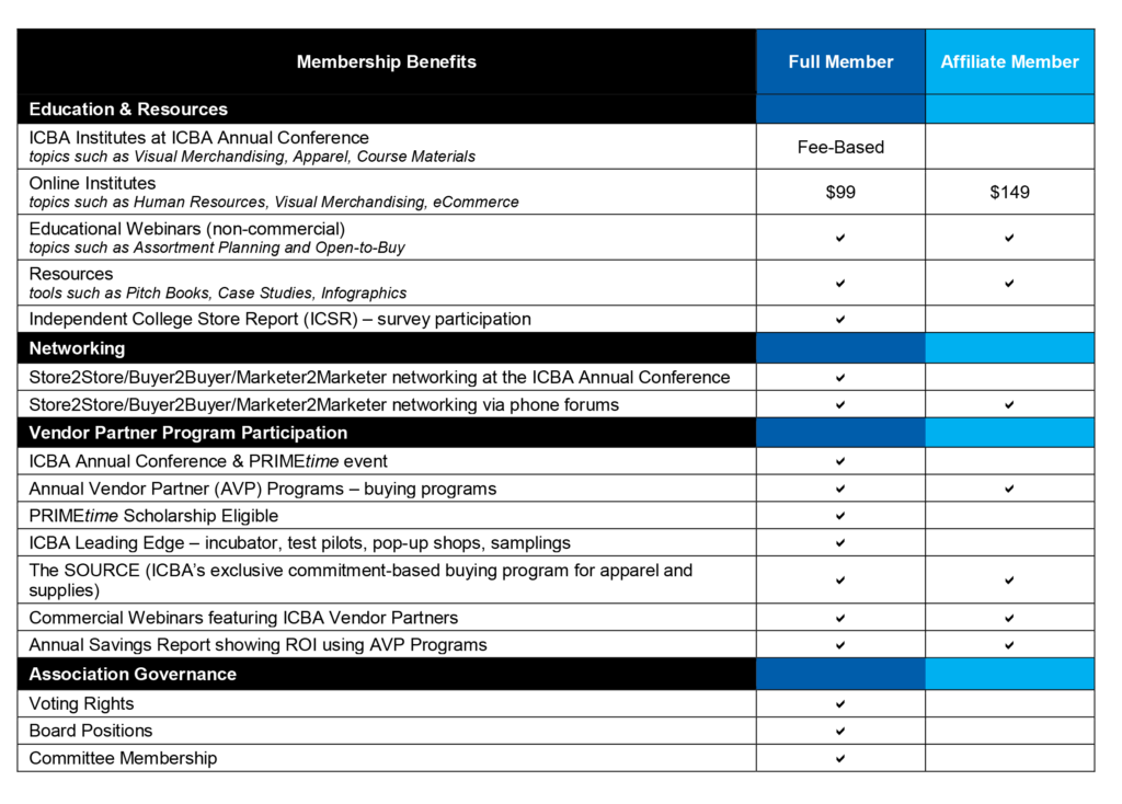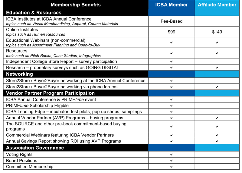 ICBA Annual Vendor Partner Programs provide advantageous group pricing to save stores money and improve their operations. As a solution for stores looking primarily for advantageous buying programs, ICBA has created an Affiliate Membership. To determine which Membership Category best meets your store’s needs, see the chart below or contact the ICBA Staff at 800-888-9222 or Office@ICBAinc.com.