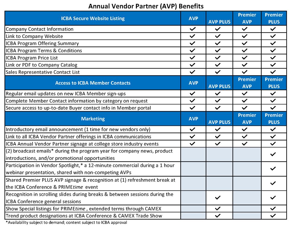 It starts with an exploratory conversation with ICBA and we welcome all inquiries! Contact vendor@ICBAinc.com to schedule a call to discuss your plans and strategies for the collegiate retail market. We will share our advice and guidance on how best to proceed and how the ICBA AVP program may support our mutual goals.